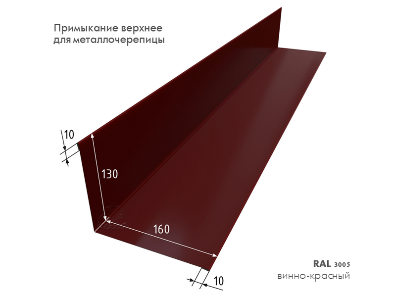 Планка примыкания для металлической черепицы — это элемент, призванный дополнять основную кровельную систему, изготовленный из того же материала и имеющий такое же защитное покрытие и окраску. Этот металлический лист изогнут под прямым углом вдоль длинной стороны, с отбортовкой по длинным кромкам.